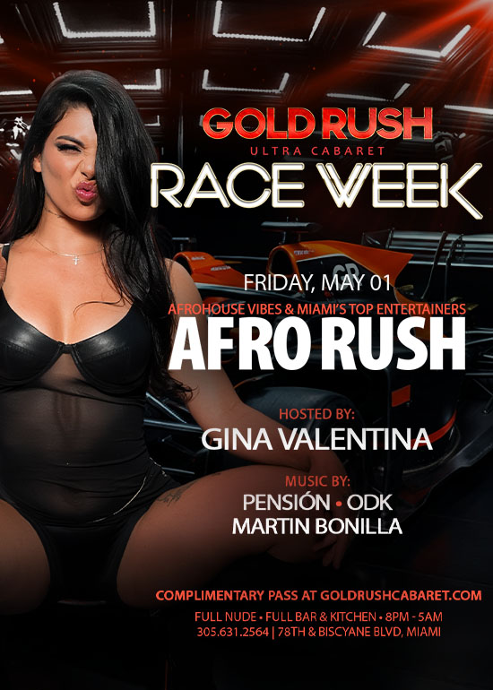 Get ready for an Afro Rush night of Race Week After Parties at Gold Rush Cabaret Friday, May 1. Come party for the most seductive nightlife experience in town. Get on the Guest List for complimentary entry before+ Food, Drink & Bottle Specials until 10pm.