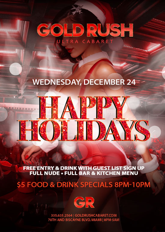 What better place to celebrate a Holidays Party than at Gold Rush Miami? Break out of the boring routine and enjoy our live DJ, beautiful dancers, food and drink specials and the best vibes. At Gold Rush Cabaret, we have the perfect venue for making the most of your party experience.